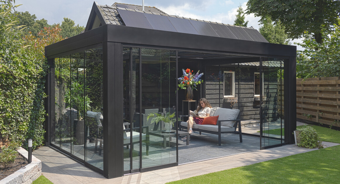 Zomers open, winters beschut: Open de schuifwanden in de zomer om frisse lucht en een gevoel van ruimte binnen te laten. In de winter creëer je een beschutte ruimte waar je toch kunt genieten van het winterse uitzicht op je tuin.