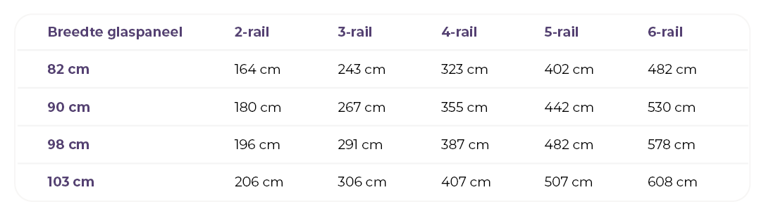 In de tabel hieronder zie je direct welke dagmaat hoort bij onze standaard glaspanelen. De dagmaat is de breedtemaat die je opmeet tussen de twee balken waar de glaswand komt.